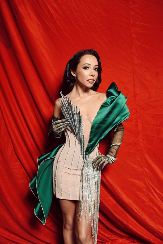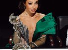 Іван Фролов продумав образ до найдрібніших нюансів: асиметричні акценти на платті, високі рукавички, розшиті кристалами, смарагдові сережки у тон і навіть взуття, деталі на якому повторювали малюнок на сукні.