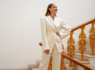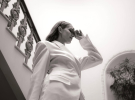 Перед камерою постала в елегантному костюмі молочного кольору.