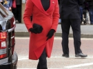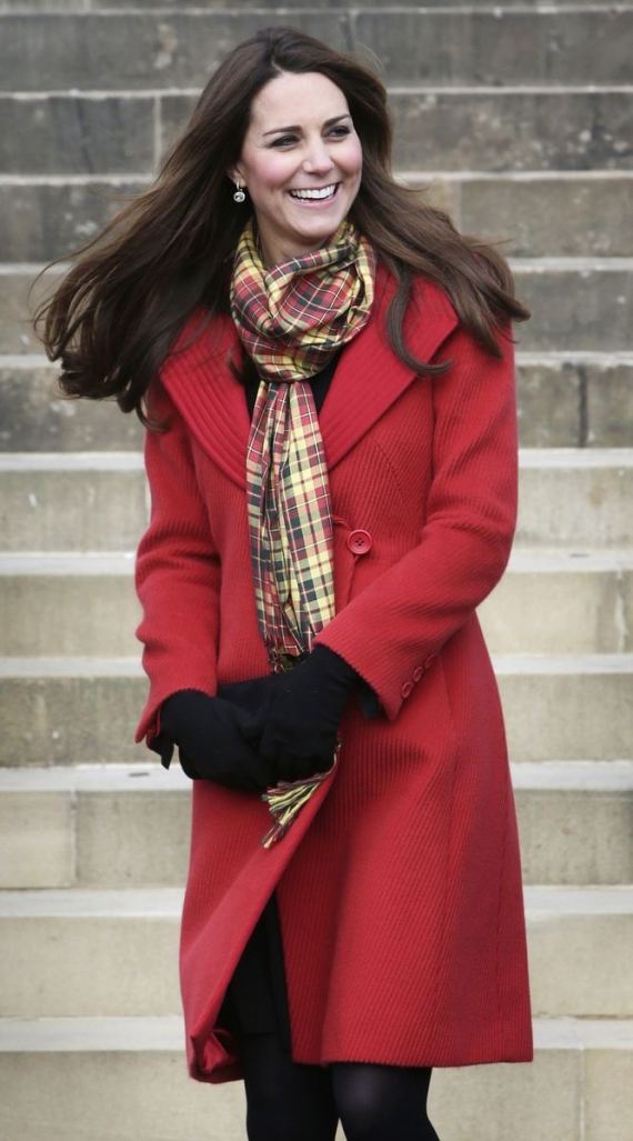 Для чергового офіційного візиту герцогиня, за вже сформованою традицією, обрала вбрання, в якому ми бачили її раніше - в червоному пальто від Armani шість років тому тоді ще Кейт Міддлтон відвідала Sovereign's Parade, в якому брав участь її бойфренд Вільям. На цей раз герцогиня Кембриджська доповнила пальто шарфом з традиційним шотландським принтом тартан і її улюбленим чорним взуттям.