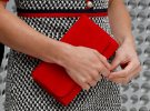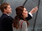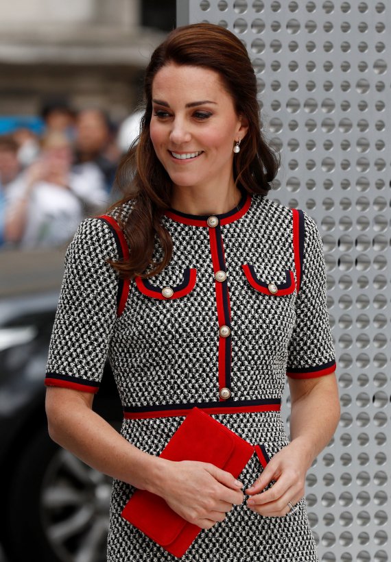 Герцогиня Кембриджська з'явилася на публіці в короткій сукні з джерсі від італійського модного бренду Gucci. Доповнила свій образ Кейт клатчем червоного кольору і класичними чорними туфлями.