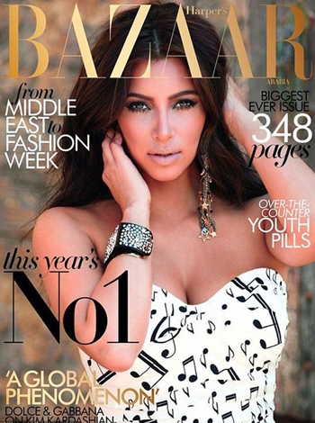 Кім Кардаш'ян прикрасила обкладинку арабського Harper's Bazaar. На сторінках журналу знаменитість з'явилася в сукнях Dolce&Gabbana, суцільно "посипаних" зірками - принтованими і вишитими.