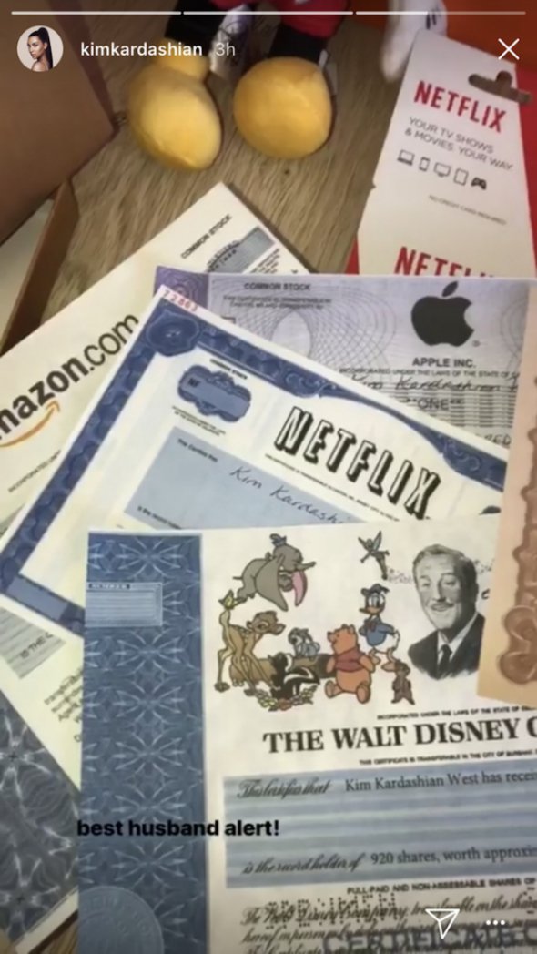 Чоловік знаменитості, репер Каньє Вест вручив їй коробку з бездротовими навушниками Apple Airpods, шкарпетками Adidas, сертифікатами Netflix, Amazon та іграшкою Міккі-Маус.