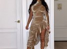 Кім опублікувала в Instagram серію фотографій. Позувала в оксамитовій сукні кавового кольору з рюшами і високим розрізом до стегна. Вбрання було з одним рукавом і невисокою горловиною. Юзери в соцмережах жартували, що сукня Кім схожа на штори.