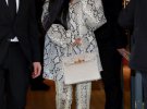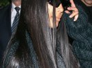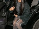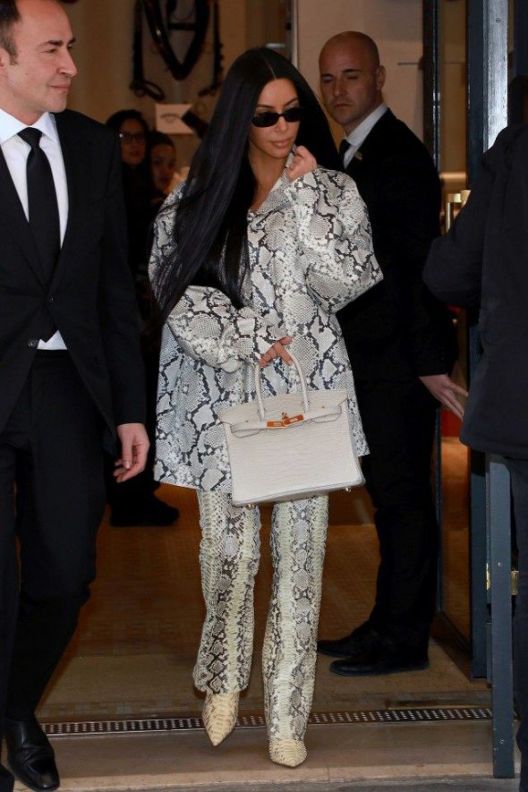 Образ Кім доповнила білими босоніжками, темно-зеленим в'язаним пальто і сонячними окулярами. Своє довге випрямлене волосся зірка залишила розпущеним, що нагадувало стиль моделі Наомі Кемпбелл. Перед цим американська зірка дивувала грубим костюмом з принтом зміїної шкіри.
