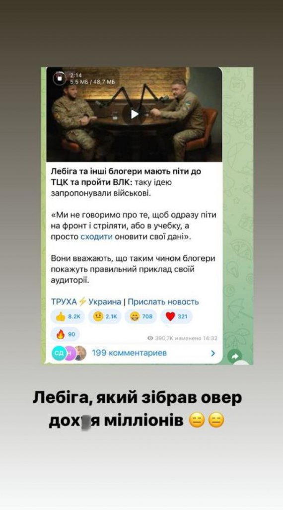 У своєму Instagram заявив, що кожен має бути на своєму місці. Він навів приклад блогера Михайла Лебігу, який зібрав понад вісім мільйонів грн на допомогу українській армії.
