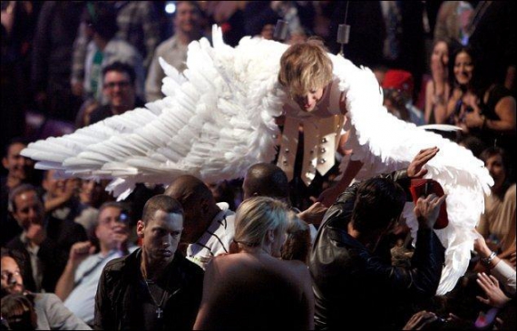 Актор Саша Барон Коен в образі свого нового фешн-гей-персонажа Бруно вручав нагороду за кращу чоловічу роль Заку Ефрону. З бутафорськими янгольськими крилами, заплутаний в кабелях, він літав над сценою і першими рядами залу під час оголошення переможця.