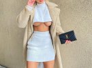 Дезіре позувала в міні-спідниці й короткому топі, що ледь прикрив її принади. На плечі модель накинула пальто бежевого кольору.