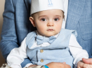 Перед камерою артист постав у блакитному костюмі. Його кохана позувала в білій спідниці та жакеті. Дитину одягли в смокінг і корону.