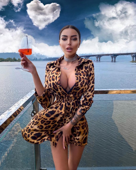 Альона одягнена у сукню із хижим леопардовим принтом із ультравідвертим декольте.