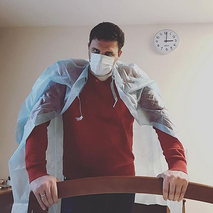 "Мій найголовніший друг і помічник", - підписала знімок, на якому актор стоїть в накидці і медичній пов'язці, Собчак.