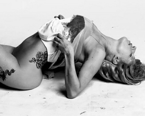 Згодом же артистка граційно влягається та задирає свою сорочку, демонструючи, що під нею нічого немає.
