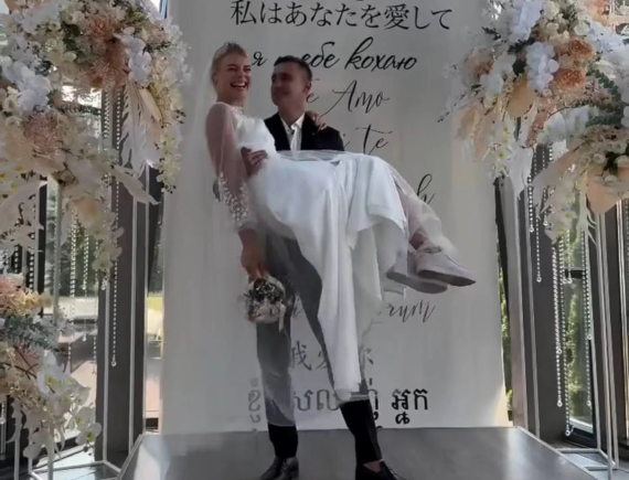 На весілля спортсменка одягла білу сукню з вишивкою, довгу фату і кеди. Образ доповнила ніжним макіяжем і прикрасами на волоссі.