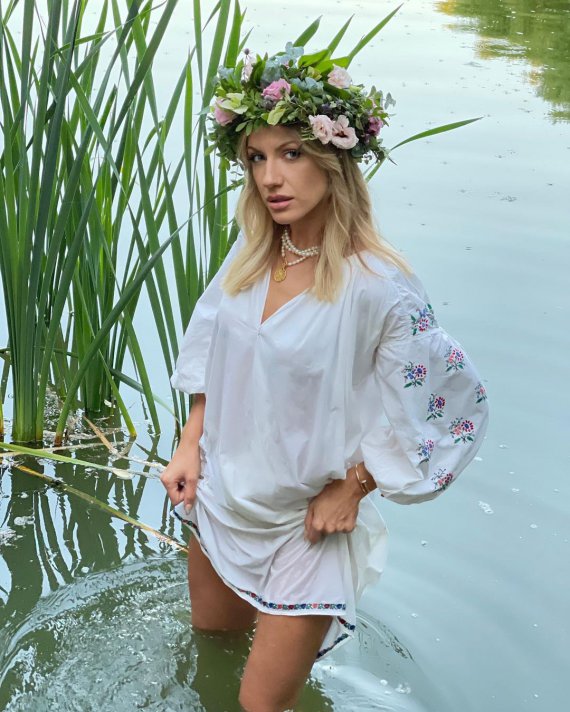 Нікітюк спокусливо позувала біля річки у вишиванці та з вінком на голові. Телеведуча також продемонструвала стрункі ноги, стоячи по коліно у воді.