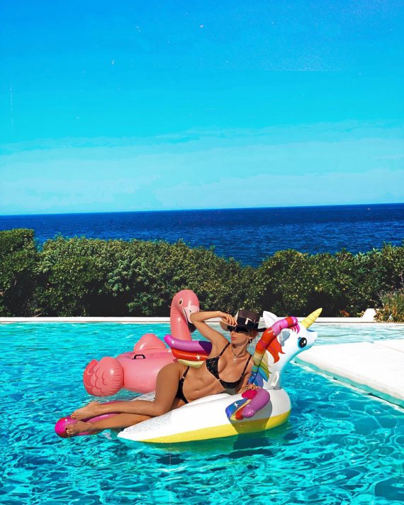 Зірка спокусливо позувала на надувному єдинорозі. Лобода одягнена в чорне бікіні. Образ доповнила капелюхом і сонцезахисними окулярами.
