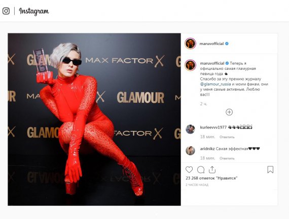 12 листопада українська співачка Maruv отримала відзнаку "Співачка року" на церемонії нагородження премій видання Glamour Russia в Москві.