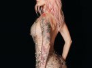 Зірка одягла мінісукню з металевої сітки, яка повністю оголювала її груди та сідниці. Образ доповнила босоніжками на масивній платформі та високих підборах.