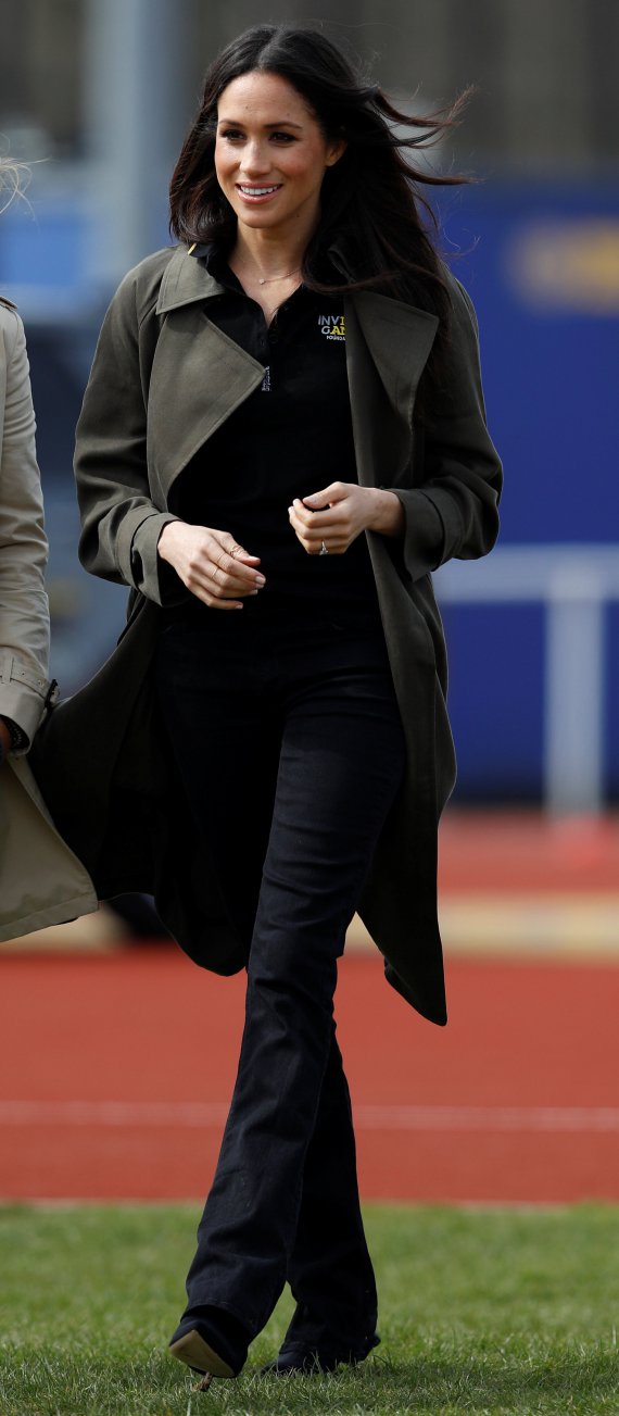 У спортивному таборі університету Бата Меган з'явилася в чорних джинсах і поло, поверх яких одягнула тренч. У нареченої принца він виявився кольору хакі від бренду Lawson вартістю 245 доларів.