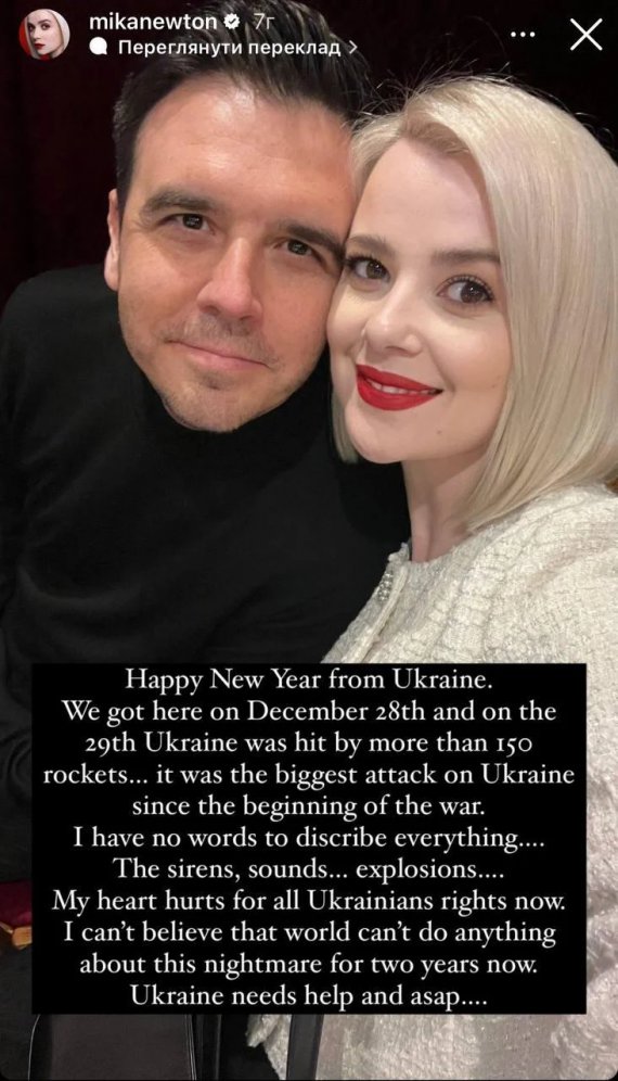 "З Новим роком з України. Ми приїхали 28 грудня і вже 29-го по Україні було випущено понад 150 ракет. У мене немає слів, щоб усе описати. Сирени, звуки, вибухи", - написала Ньютон.