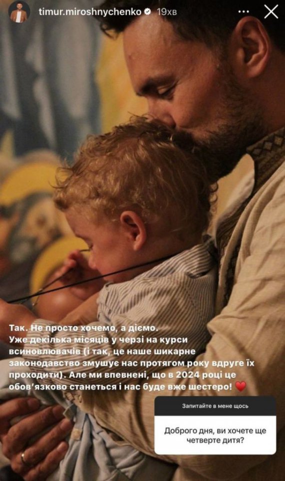Український ведучий Тимур Мірошниченко заявив, що він з дружиною Інною уже стали в чергу на курси усиновлювачів.
