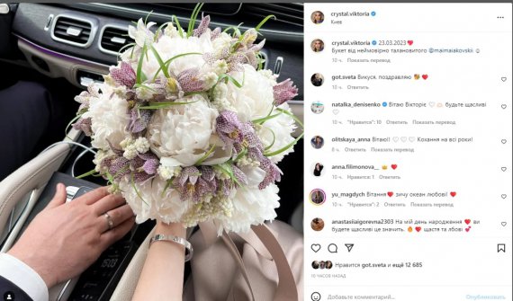 Апанасенко опублікувала фото з чоловіком у машині, на якому демонструє свій весільний букет. У сторіз вона показала свою зачіску у день весілля, яку зробив зірковий перукар-стиліст Михайло Прус.