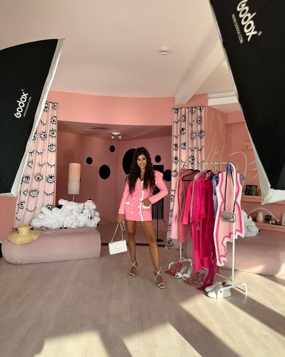 Також блогерка позувала в трендовій рожевій піжамі, спортивному костюмі, літній сукні та купальнику.