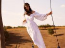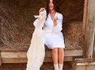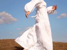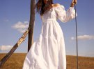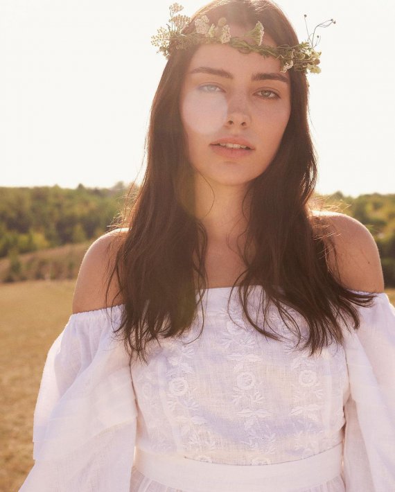 Модель позувала в полі. Вона одягла вишиту сукню білого кольору та вінок з польових квітів. Образ доповнила білими шкарпетками та гумовими черевиками.