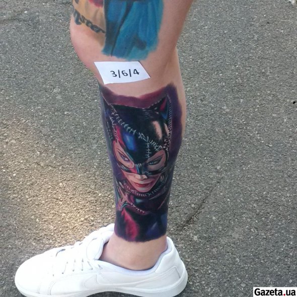 Роботою у номінації "Кольорове тату" хизується Олексій, який виступив моделлю майстра відомого у своїй сфері, як OLEG BLACK. На нозі у чоловіка зображений персонаж з історії про Бетмена супер герой жінка-кішка.