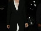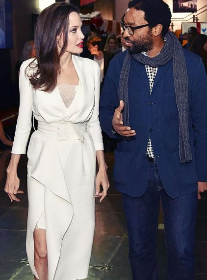 Акторка одягла молочну сукню з мереживним топом Ralph&Russo в поєднанні з чорним пальто. Свій розкішний образ Джолі поєднала з золотими туфлями-човниками на каблуці і яскравою червоною помадою.