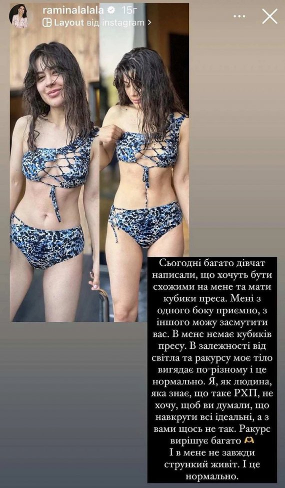 "Мені, з одного боку, приємно, а з іншого можу засмутити вас. В мене немає кубиків пресу. В залежності від світла та ракурсу моє тіло виглядає по-різному і це нормально. Я, як людина, яка знає, що таке РХП (розлад харчової поведінки – Gazeta.ua), не хочу, щоби ви думали, що всі навколо ідеальні, а з вами щось не так", – зазначила Есхакзай.