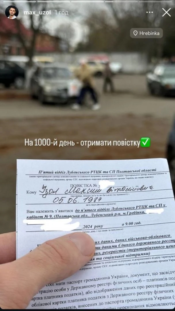 Український ведучий і блогер Максим Узол повідомив, що отримав повістку.