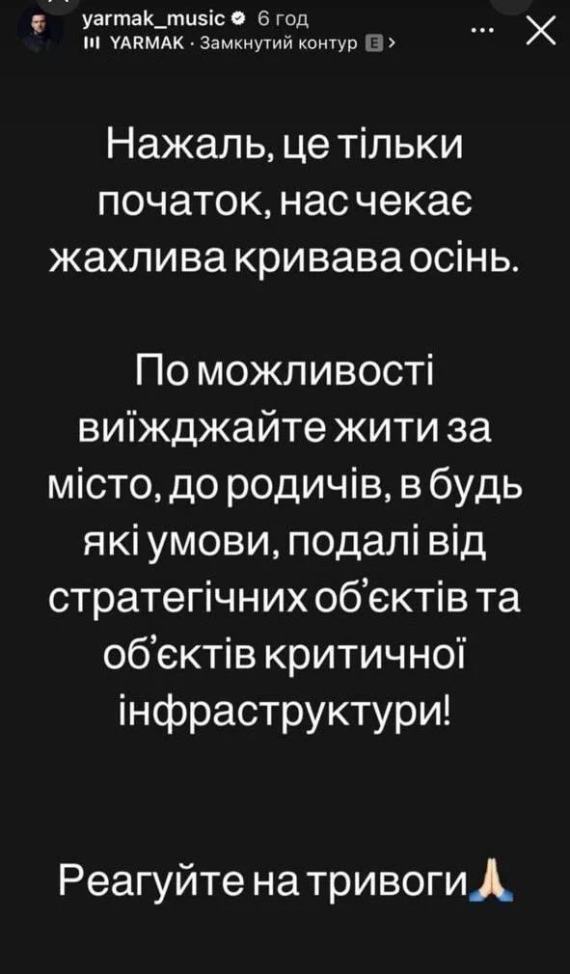 "На жаль, це тільки початок, на нас чекає жахлива кривава осінь. По можливості виїжджайте жити за місто, до родичів, у будь-які умови, подалі від стратегічних об'єктів критичної інфраструктури. Реагуйте на тривоги", - написав чоловік.
