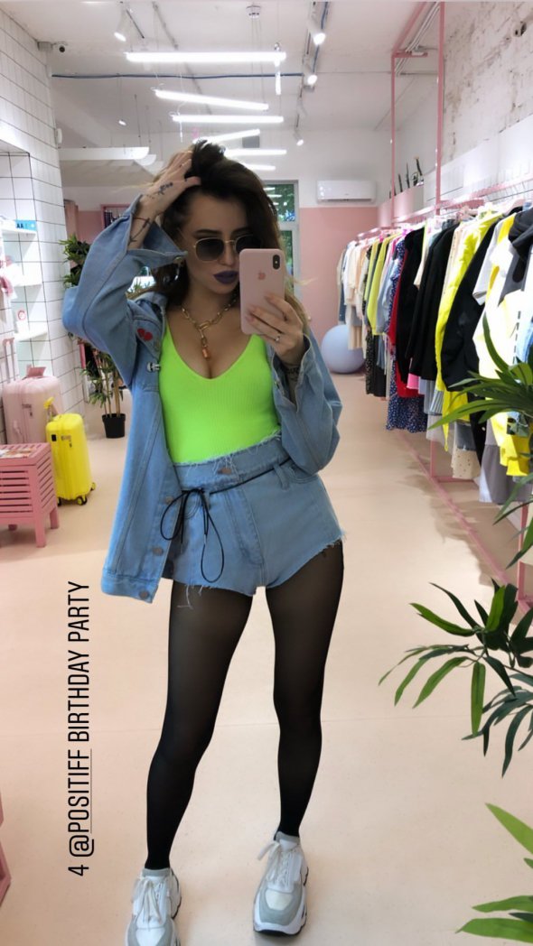 Співачка надягнула короткі джинсові шорти, чорні колготи, яскраво-салатовий топ і джинсову куртку.