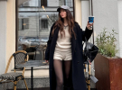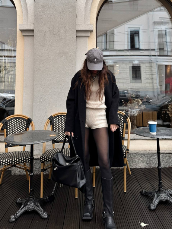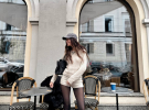 Аутфіт доповнила чорними колготками, чоботами, бейсболкою і масивним ланцюгом на шиї. Наверх накинула пальто, а в руках тримала масивну сумку.