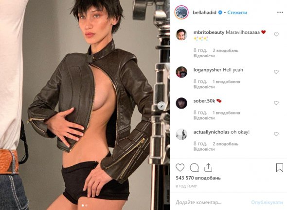 Пікантними фотографіями знаменитість поділилася в своєму Instagram. Швидше за все – це нова фотосесія Хадід. Адже, крім відвертого одягу, Белла постала і з новою стрижкою - незвично коротким волоссям.