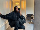Ще один аутфіт зацікавлює стриманістю. Мільярдерка одягнула чорні широкі джинси і куртку, а також чорно-білі кросівки. Образ доповнила масивною сумкою.