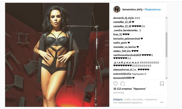 На фото Каменських у чорній білизні та напівпрозорій шалі на плечах. Образ артистка доповнила ефектним макіяжем. Знімок зібрав у соцмережі більш ніж 10 тис. лайків.