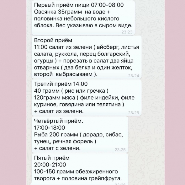 "Друзі !!!!! Ось моє меню на цей тиждень !!!! Чому так і чого там😂 питайте у мого тренера @khomytskyi_official! Він його складав - йому і відповідати☺️ хто питав! МІЙ зріст 174 ПАРАМЕТРИ 92-71-102", - підписала скрін з меню Каменських.