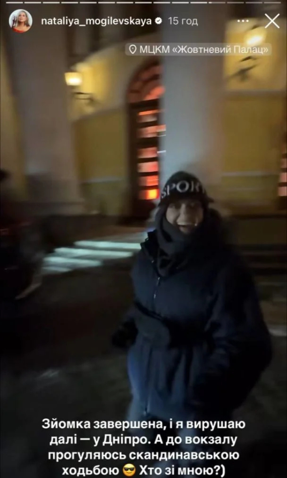 "Знімання завершилися. А зараз я вирушаю далі. У мене за півтори години потяг у Дніпро. А до вокзалу прогуляюся скандинавською ходьбою. Щоб ви розуміли, я так роблю після кожного концерту. Бо хочу бути в ідеальній формі, адже в наступному році у мене ювілей. Ось така я спортсменка - мінус 15 кіло", - розповіла виконавиця.