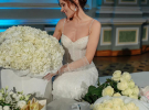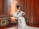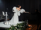 Жінка одягла довгу білу сукню з шлейфом, відкритою спиною і масивними рукавами.