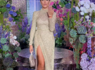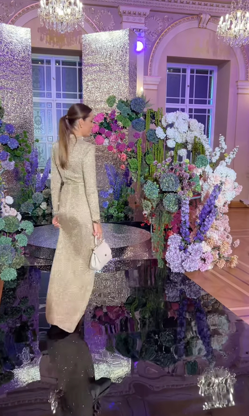 На кадрах, опублікованих в Instagram, блогерка позувала в чеському ресторані. Одягла золоту мерехтриву сукню та бежеві туфлі.