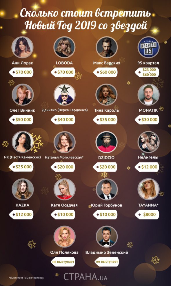 В цьому році мало хто із знаменитостей вибрав закриті заходи, більшість – будуть виступати в ресторанах на гучних вечірках. Пропонуємо підбірку гонорарів, які отримують українські зірки за виступ в новорічну ніч, пише Страна.