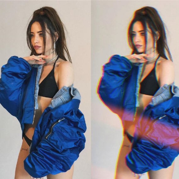 Дорофєєва постала перед камерою у чорній білизні та синьому бомбері на голе тіло. Волосся зірке було зібране у незвичну високу зачіску. Наді зробили яскравий макіяж.