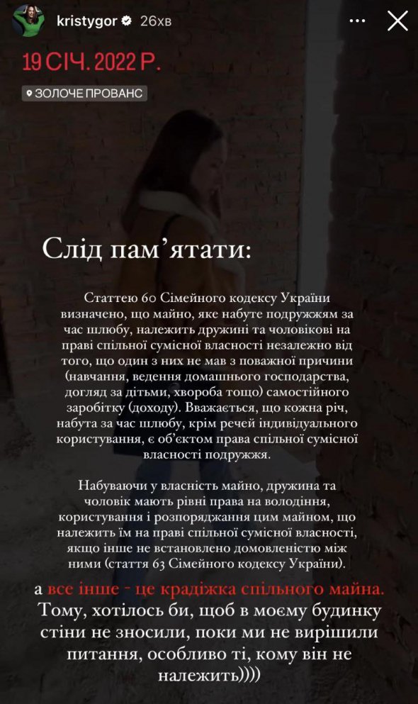 Ексдружина Володимира Остапчука, Христина Горняк, нагадала ведучому, що будинок, у якому він із теперішньою дружиною планують ремонт, належить і їй також.