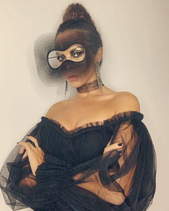 На опублікованому в Instagram фото вона позує в чорній сукні з глибоким декольте та об'ємними рукавами з сітки. Образ доповнили велика маска, сережки, чокер на шиї та яскравий макіяж у золотих тонах.