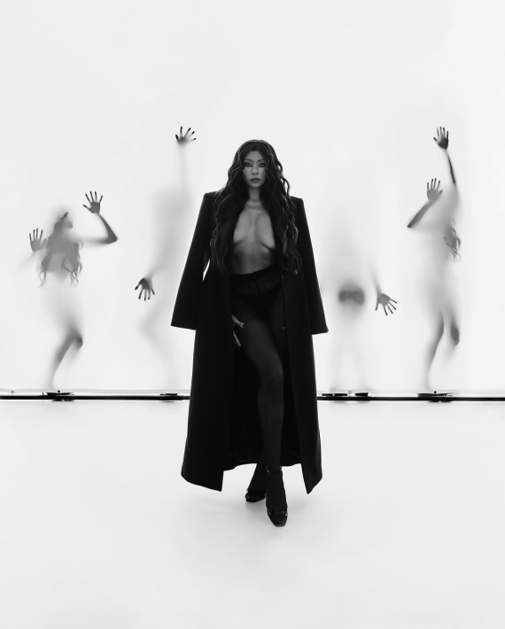 На кадрах, опублікованих в Instagram, блогерка позувала в колготках і тренчі на оголене тіло.