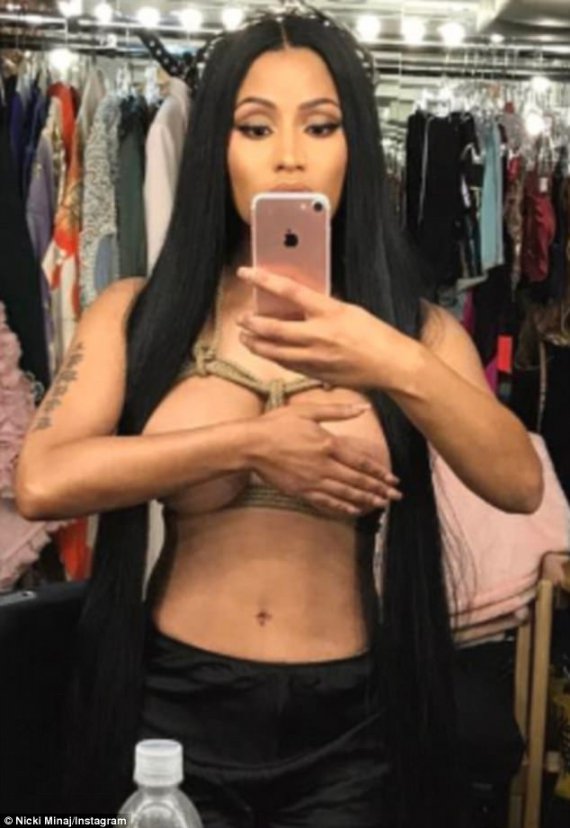 Співачка Ніккі Мінаж поділилась з прихильниками відвертими фото: зірка похизувалась принадами топлес у гримерці на зйомках кліпу.