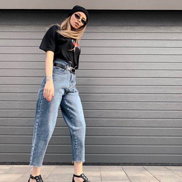Жінка показала на фото до посту стильний "карантинний" образ. Надя позує поруч із гаражем свого приватного будинку. Вона одягнена в чорну футболку з великим написом, джинси-"варенки" з завищеною талією та необробленим краєм, чорну шапку і сонячні окуляри. На ногах – оригінальні чорні шкіряні черевики.