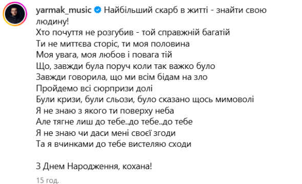 Український репер і військовий Олександр Ярмак привітав дружину Анну з 35-річчям.
