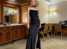 Образ доповнила туфлями-човниками в тон, чокером, золотими прикрасами і контрастним макіяжем.