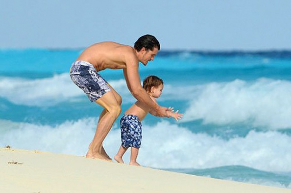 Поки Міранда Керр працює в поті чола, її чоловік Орландо Блум і син Флінн продовжують свої мексиканські канікули - тато з малюком купаються і засмагають у Канкуні.